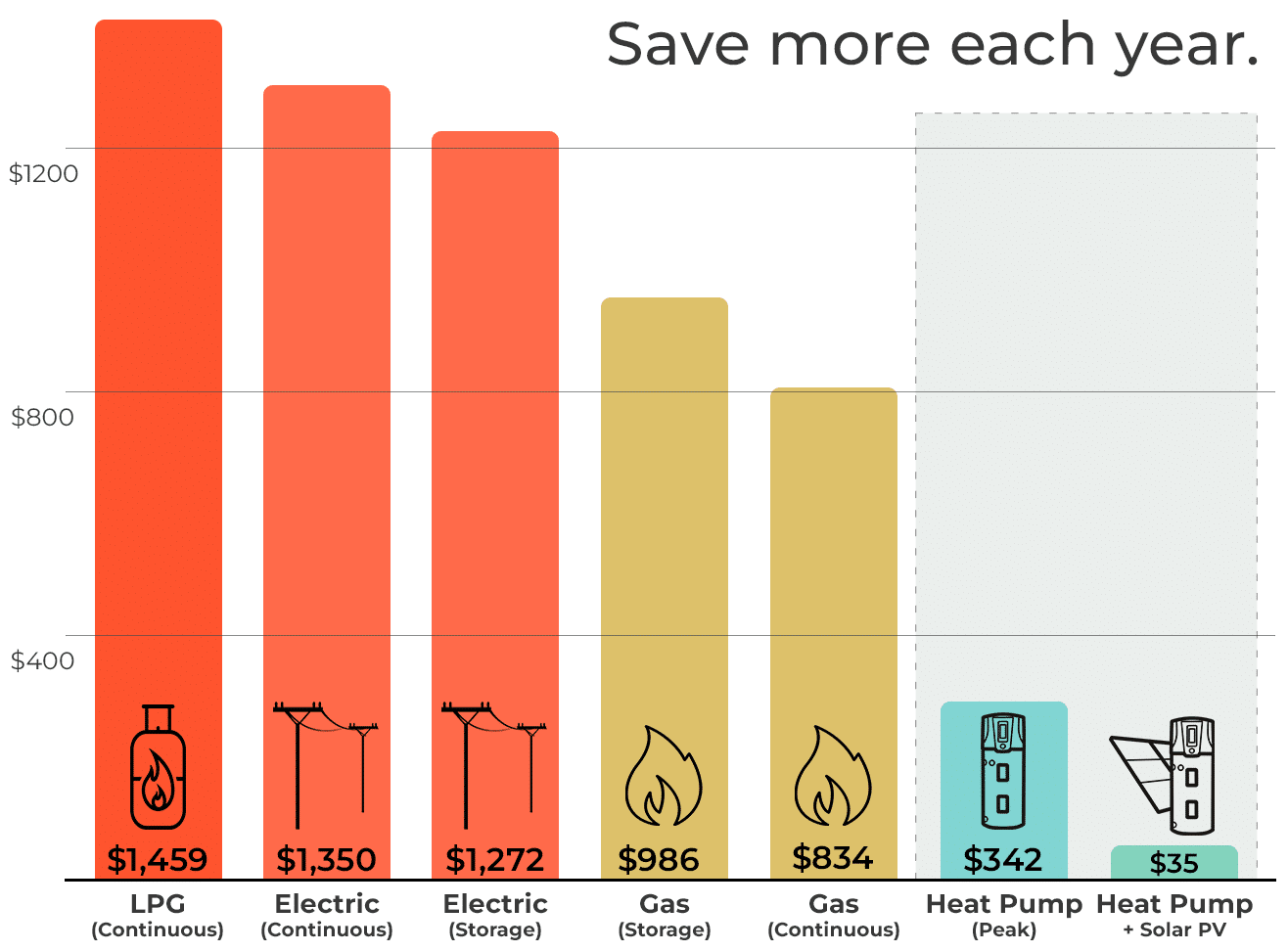 State and Federal Government initiatives, including the Victorian Energy Upgrade Program, allow us to offer the supply and installation of new heat pumps at significantly reduced prices for eligible households. This upgrade can save you hundreds in long-term costs, reducing energy bills by up to 80% based on average water heating usage.